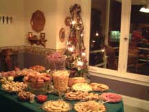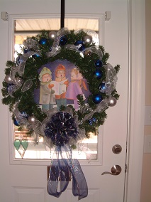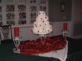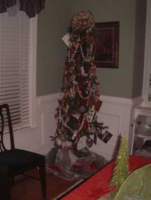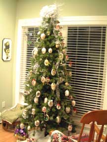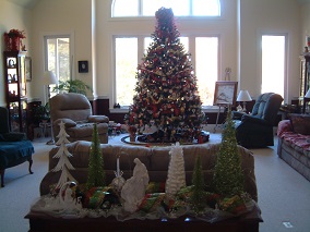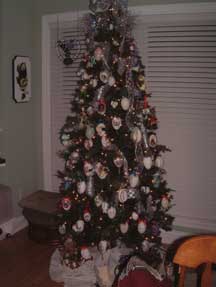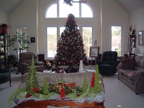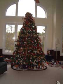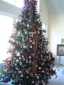Pictures of 12 ft tree in Living Room. This tree is decorated with collectibles and hand made ornaments. Bows and ribbons add to the decorations. Over 700 ornaments on this tree!