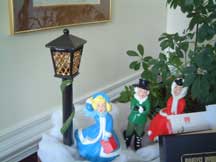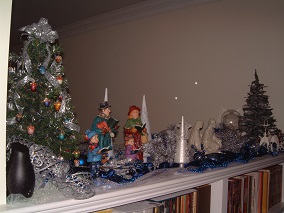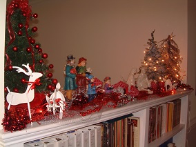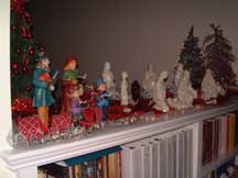 Carolers and nativity along with 3 lighted trees decorate the bookcase in the hall. - 2013