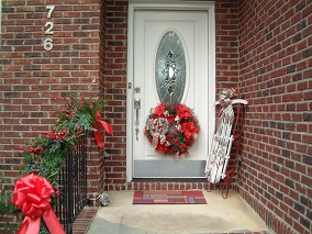 Small decorated wreaths on the stairs.