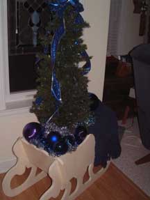 Sleigh and lighted tree at bottom of stairs.
