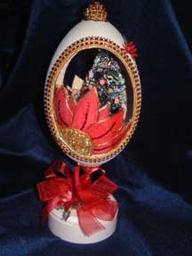 Egg shell is cut around the poinsettia print. Inside is a gingerbread house and hand made candies. Kay's design.