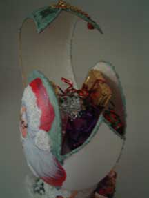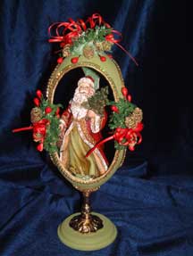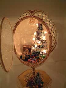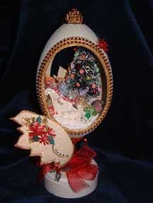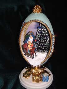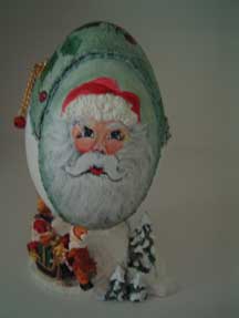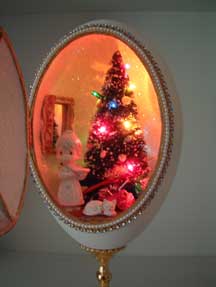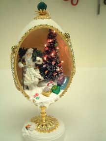 This egg was designed by Kay and features a Pipka Santa with a lighted tree.