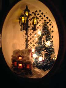 A design by Kay, this rhea egg features a lighted house, lighted lamp post and lighted Christmas tree.