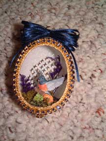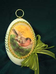 Blue bird ornament in pheasant egg with sapphire stones. Designed and decorated by Kay.