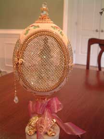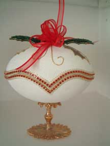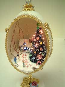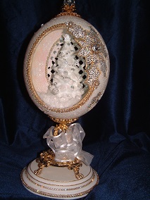 A Dot Cannon design, this ostrich egg has mesh covering the openings and the mesh has flat back stones at each section. Inside are snowbabies and a lighted tree. Made by Kay at the Ohio Egg Show - class taught by Dot.
