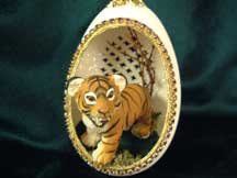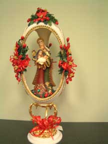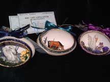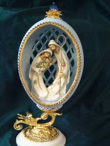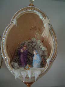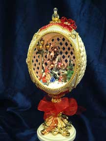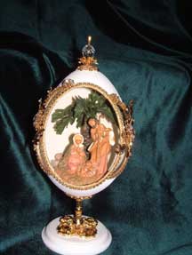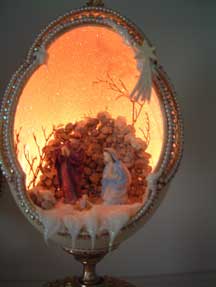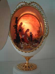 The ostrich egg above is one that was designed for the S. C. Egg Art Guild class. The egg is very elegant and has a push button light switch that activates the light behind the nativity. This egg was designed and taught by Kay.