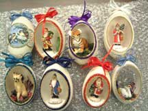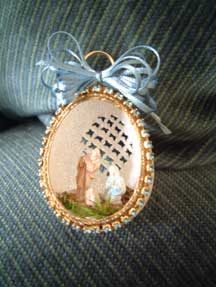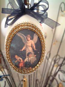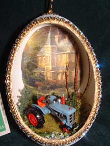This ornament was made for my dear brother, Aubrey. This goose egg features a Thomas Kinkade print on the inside back and a Hallmark tractor. Design by Kay.