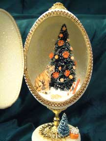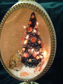 A design by Kay, this rhea egg features a Precious Moments grandma and her kitty in front of their Christmas tree. The pictures show the egg door closed; the egg with the tree not lighted and the egg with the lights turned on.