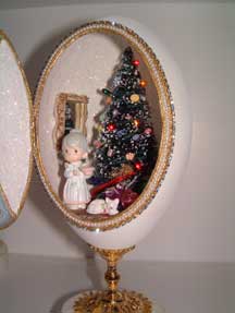 A design by Kay, this goose egg features lots of lattice and a Precious Moments December figurine inside.