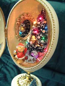 A design by Kay, this rhea egg features a lighted tree with lots of packages and toys and a Santa bear.