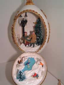 This ostrich egg has 3 oval doors that hinge downward. Each door has a snow scene. The center of the egg is done with a revolving ice skater scene.