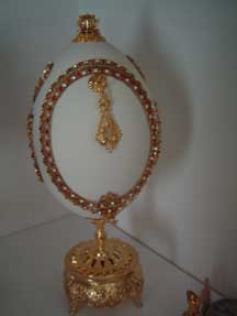 White Christmas - designed by Dot Cannon. Egg is completely covered with white beads and clear stones. Tree has light inside.