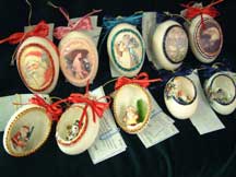 Rhea eggs above are cut and 'extended' with filigree to house a tall nativity (left picture) and a santa (right picture). Original design by Kay.