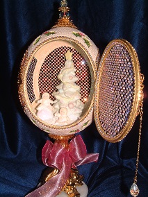 A design by Kay, this egg features a lighted tree with a miniature boy and girl kneeling in prayer.