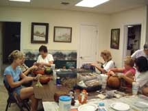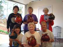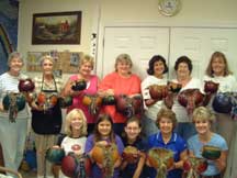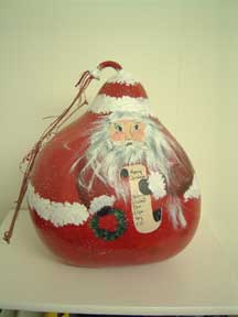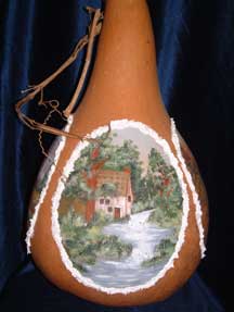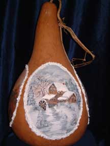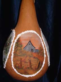 A special large gourd grown by Mr. Chavis. I had this gourd for several years before finally deciding what to do with it. I designed the 4 seasons and each design is painted using acrylics. From left: Winter, Spring, Summer, Fall. Won blue ribbon at Fair, 2009.