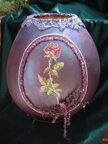 Gourd designed by Kay is painted purple. The rose is made from almost 900 Swarovski flat back stones in shades of rose, light rose, peridot, tourmaline and siam.
