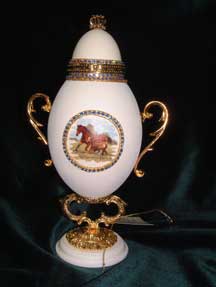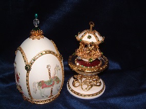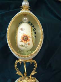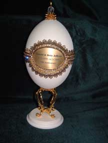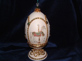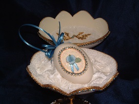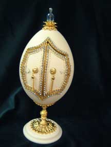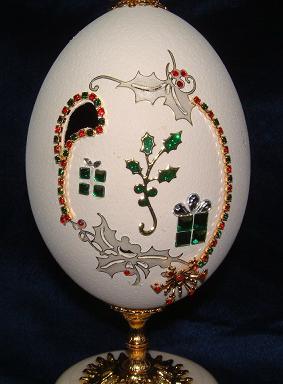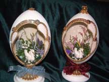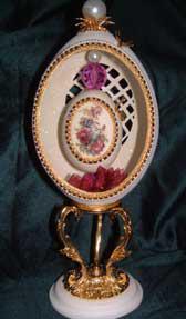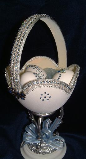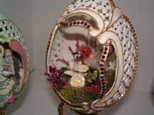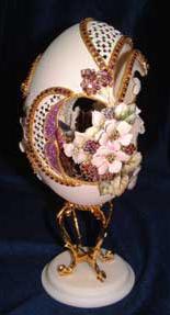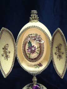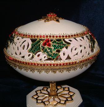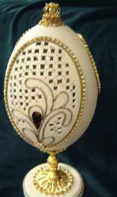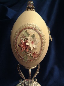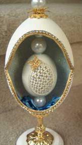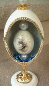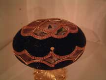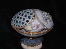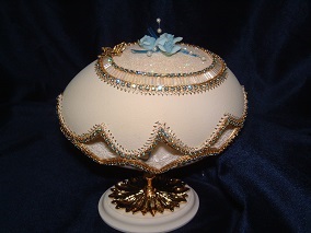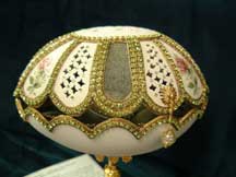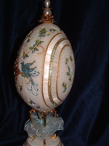 Eggs above show different designs of jewel boxes with goose egg ornaments. This egg was designed by me and taught to the SC Egg Art Guild ladies. Each lady chose the color of stones she desired.
