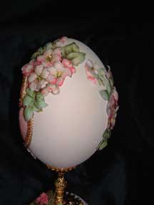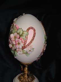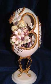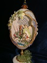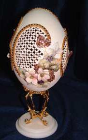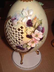 This egg was designed by Kay and features a hand painted house with a light inside. The egg has lots of lattice and scrolls and uses the tole method to create 3-D flowers from the prints. An elegant egg. Blue ribbon winner 2008.