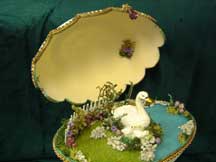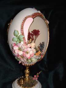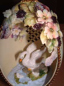 Rhea egg is decorated with tole flowers and bead grapes. Inside is a pond with a swan and her babies. Pictures show front and back of egg. This egg won a blue ribbon at the fair! Designed by Kay