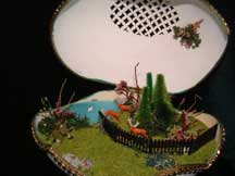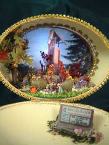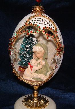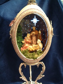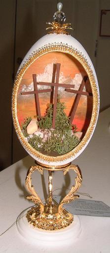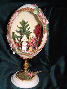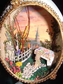 This egg was created and designed by Kay and features a Kinkade print mounted in the back of the egg with a light behind it. The prayer bench was made from wood and uses painted egg shells that were broken into small pieces to create a mosaic pattern on the bench.