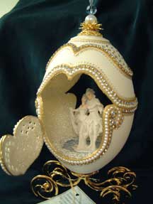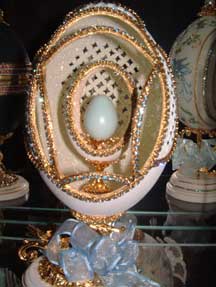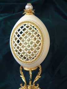 Rhea egg with goose egg inside. Pictures show the goose egg with front lattice (back is the same); Middle picture shows the back of the rhea egg and the last picture shows the side of the goose egg. The goose egg turns when the pearl finial on top of the rhea egg is turned. These eggs were designed by Kay.