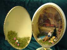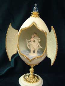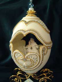 The Guardian Angel egg features a rhea shell cut with lattice and scrolls and worked with paper tole and stones. Inside is the Guardian Angel figurine with a lake scene. Sky is painted as if the sun is setting. A Kay design.