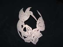 These designs are original designs by Kay and feature Rhea egg shells that are cut with a high speed drill. These designs are then cleaned, painted and mounted in shadow boxes.