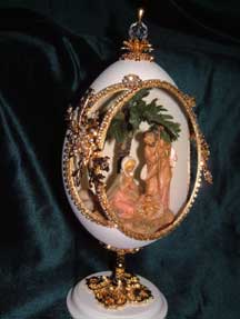 Egg designed by Kay for S. C. Egg Art Guild class; features the star of Bethlehem behind the Holy Family; stones set in silver, silver beads and cord and punch flowers complete the sides and back.