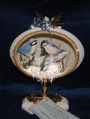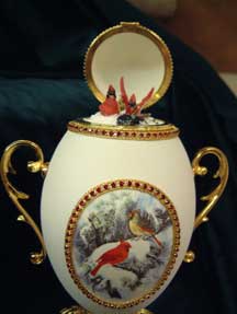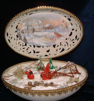 A Dot design shell, the egg was decorated by Kay and features cardinals playing in the snow. A print from a card is mounted in the top inside that also has cardinals in the snow.