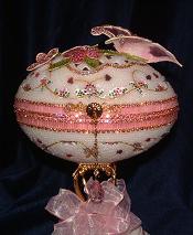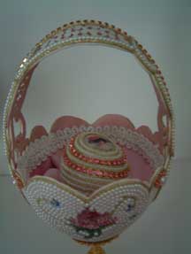 Basket covered with pearls and lined with pink satin. Decorated guinea egg sits inside. Made by Kay and adapted from a Joan Huff design.