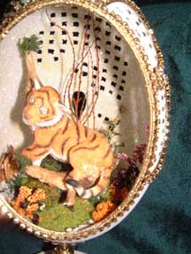 Sleeping Tiger - Pictures show the front, inside, and back of the egg. An original design by Kay - Made for Dr. Tripp Jones for my brother Aubrey. (Inside is part of a cotton burr from his farm - Poole's Farm)