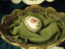Two adaptations of the black cameo jewel box, the egg on the left is done with a mauve cameo; the right has a painted flower cameo. Both designed by Kay.