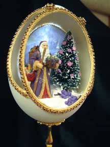 This egg has a kinkade print mounted in the back with a light behind the print. A Pipka Wine Country Santa, a tree decorated in purples and bunches of grapes in the snow complete the decoration. Designed by Kay.