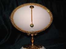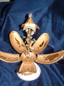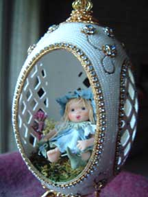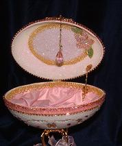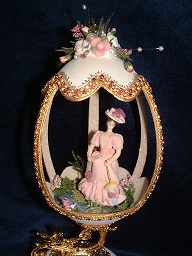 This is a very elegant egg with dancers inside. The egg is worked with faux pearls, gold cord, sawtooth and light sapphire stones. The dancers stand on a velvet platform. Made by Kay, this egg was adapted from a Joan Huff design.
