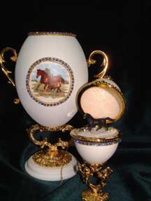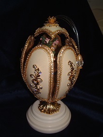 Rhea egg completely covered with jewels and beads; Birds on each side are worked with Swarovski stones. Inside is a goose egg decorated the same that has a working clock. Designed by Dot Cannon. (Pictures show the egg closed; opened to show the goose egg; the side and back)