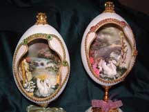 Below are rhea eggs that use duck eggs inside. These duck eggs turn when the finial on top of the rhea is turned. These are original designs by Kay.