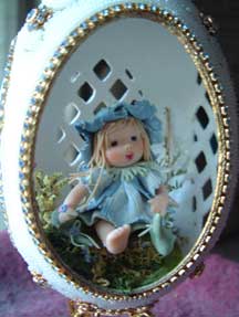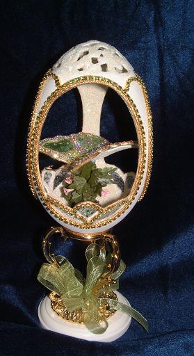 Rhea egg designed by Kay features tole apple blossoms and scrolls. Inside is a Precious Moments painted pewter flower girl figurine in a garden with lots of clay flowers; dried flowers and a pond. The magnolia tree is made from filigree, painted green and dipped in green fuzz; white paper flowers are added for the blossoms. This egg won a blue ribbon at the state fair, 2009.