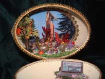 Above egg was designed and created for the very special person who takes care of our rock garden at church. The picture is of the bell tower and has a light behind it. Kay's original.
