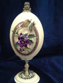 This rhea egg was designed by Kay and features 2 doors with silver plated amethyst jewels and punched purple flowers. Inside is a goose egg decorated the same as the back of the rhea egg. There is a light inside the goose egg. This egg won a blue ribbon in 2011. This egg was also taught by me for the S. C. Egg Art Guild.